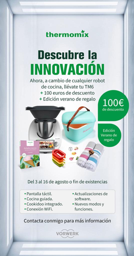 Este Agosto Thermomix te rebaja el precio del nuevo TM6 en 100€, sólo por entregar cualquier viejo electrodoméstico, accesorio o utensilio que tengas en casa y que el TM6 pueda sustituir. Y además, de regalo la fantástica edición de Verano para que tengas un día de playa o piscina estupendo!