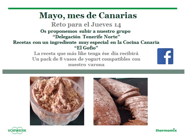 Hoy jueves 14 día de recetas Canarias en nuestra página del Facebook de Delegación Tenerife Norte! Entra y publica tu mejor receta con Gofio y participa en el concurso para que ganes unos vasitos de yogur para el Varoma. El que más likes tenga será el ganador! Así que invita a todos tus amigos a entrar para que te voten y ver todo lo que podemos hacer con Thermomix!