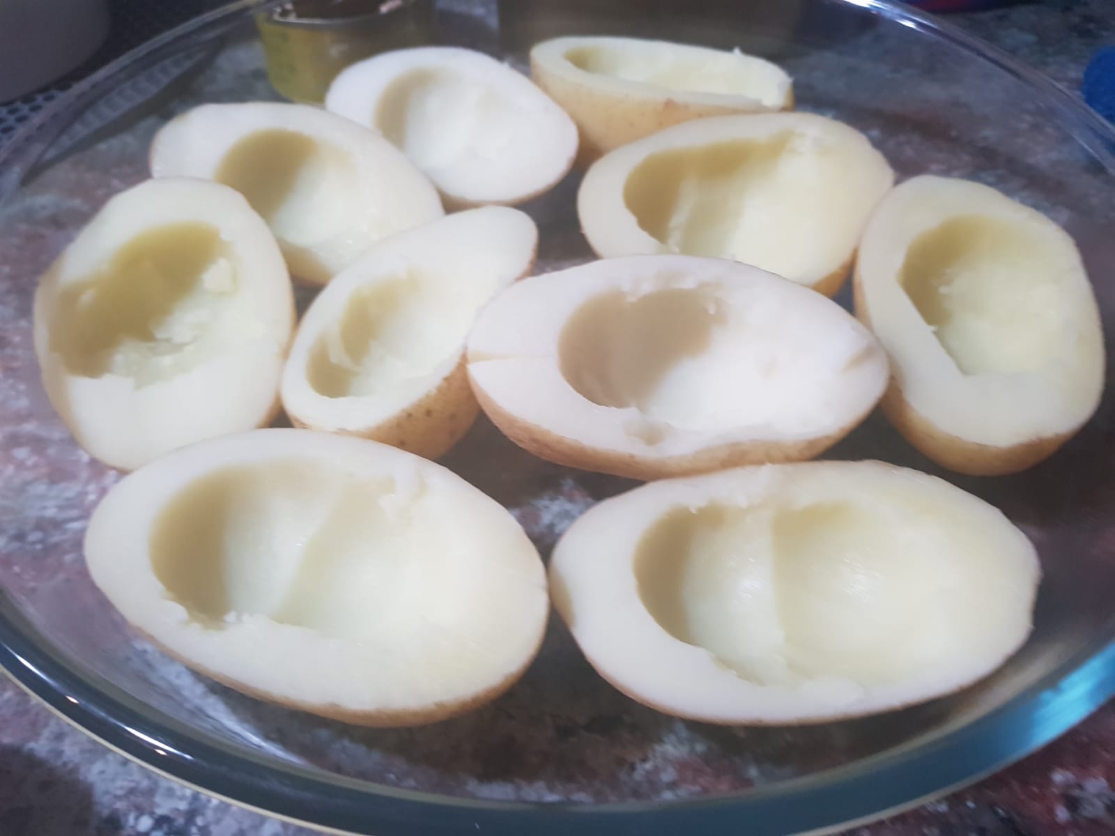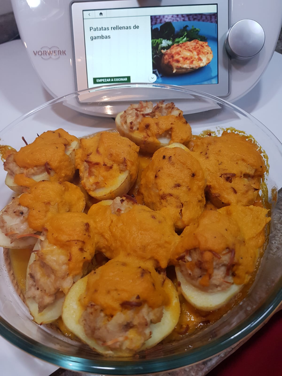 5.- Incorporamos el atún y la nata y programamos 6 min/90°C/vel 1. Mientras tanto, retiramos parte de la pulpa de las papas con una cuchara o un sacabolas (reservamos) dejando un hueco para rellenarlas. Colocamos las papas en una fuente de horno (con el hueco hacia arriba).