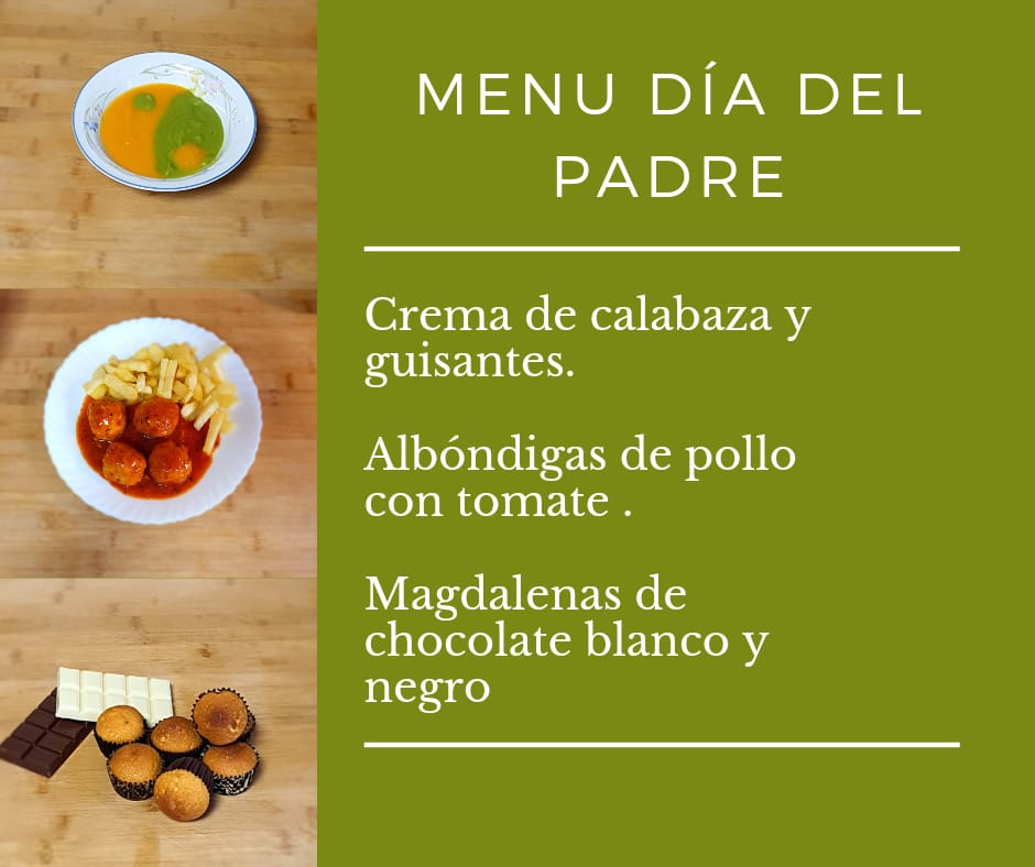 Crema de calabaza con crema de guisantes- Albóndigas de pollo con tomate-Magdalenas de chocolate blanco y negro