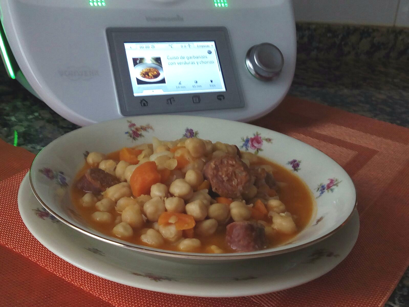 - Añadimos los garbanzos y programamos 12 min/100ºC/giro inverso/vel cuchara. Vertimos en una sopera y dejamos reposar unos minutos.