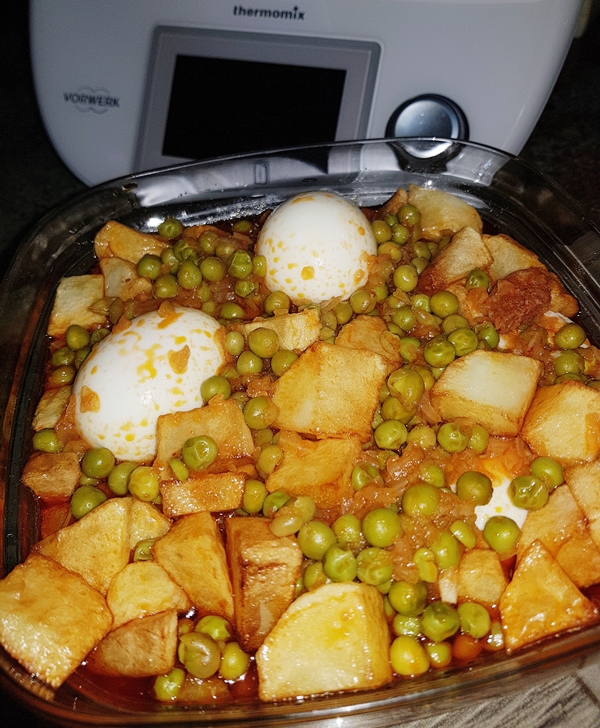 Nota: He sustituido el jamón por chorizo y le añadí unos huevos cocidos y unas papas.