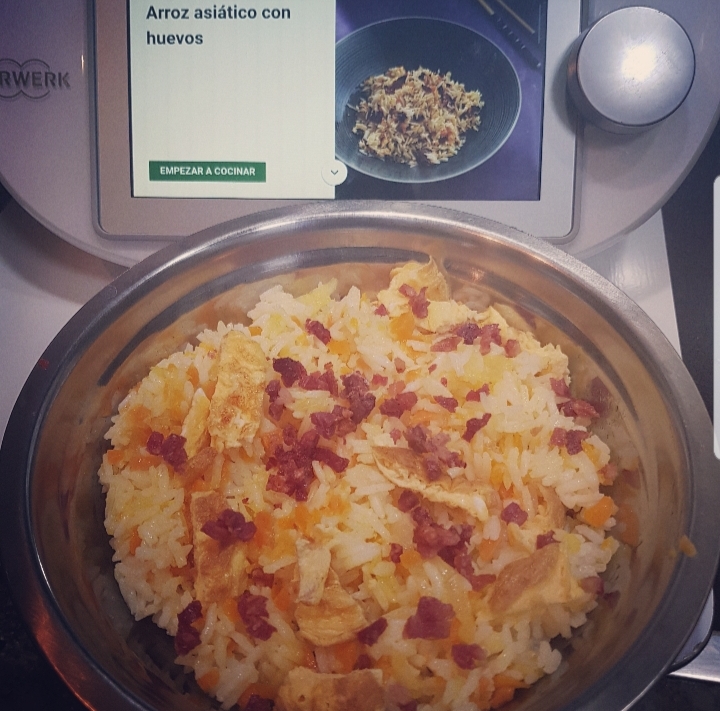 8.- Retiramos el cestillo y vertemos el arroz sobre los ingredientes reservados. Añadimos el beicon troceado, mezclamos suavemente con la espátula y servimos caliente.