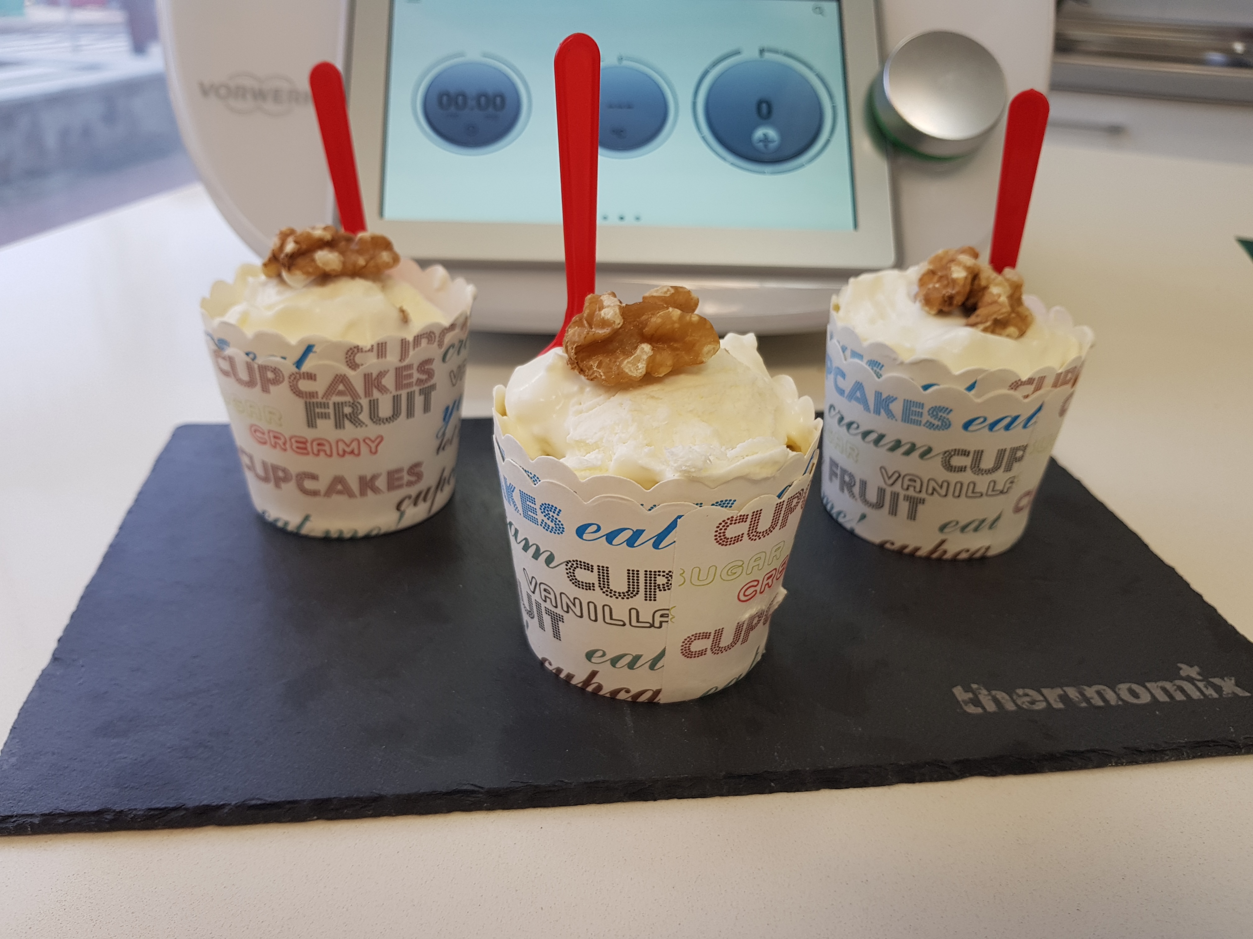 3. Sacamos en trozos y trituramos a vel 5/20 seg, servimos adornando con una nuez.