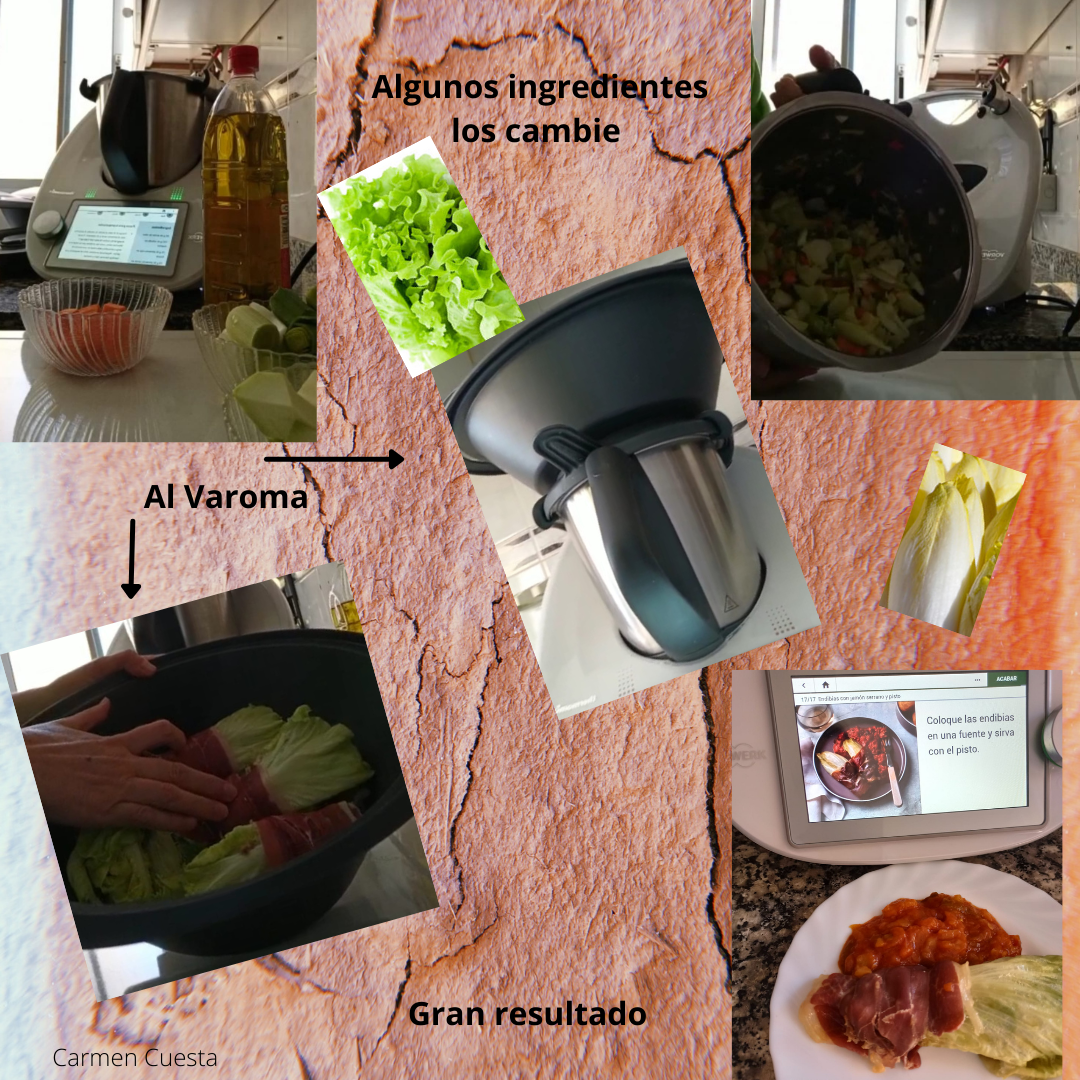 1. Ponga en el vaso el aceite, la cebolla, el pimiento rojo, el pimiento verde y el calabacín. Trocee 4 seg/vel 4 y sofría 10 min/120°C/giro inverso/vel 1. Mientras tanto, corte las LECHUGA (sécalas muy bien) por la mitad a lo largo y envuelva cada mitad en una loncha de jamón. Reparta las endibias entre el recipiente y la bandeja Varoma, tape y reserve.