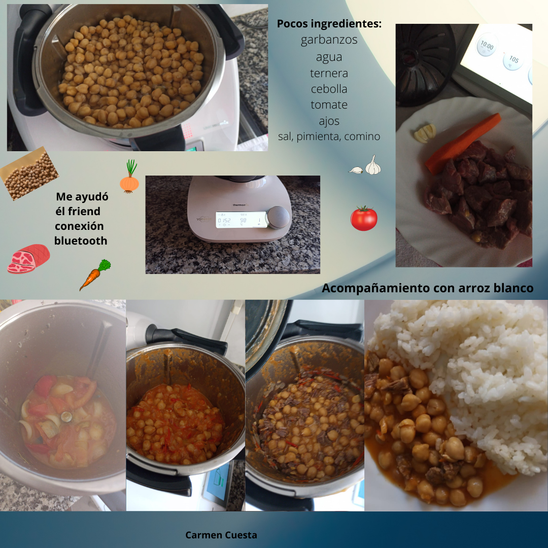 Añadir la carne, y los garbanzos al sofrito y cubrir con el caldo de la ternera, sin que sea caldoso, lo puedes acompañar con papas fritas o con arroz blanco, yo en esta ocasión le hice un arroz blanco en el cestillo.