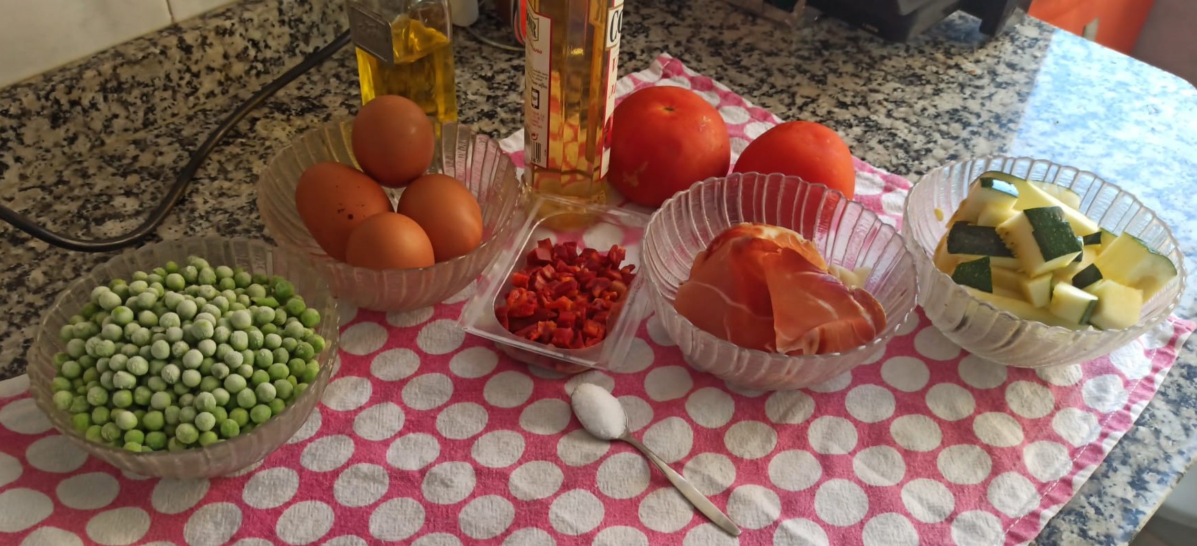 5. Añada el pimiento y los guisantes y programe 1 min/120°C/giro invertido/vel cuchara. Vuelque en un molde de aluminio de Ø 20 cm x 4 cm de alto. Con la espátula, haga 2-4 huecos y casque en ellos los huevos. Coloque el molde sobre la bandeja Varoma dentro del recipiente Varoma.