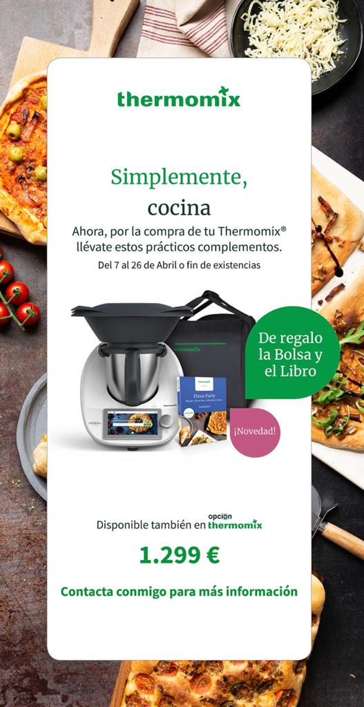 Del 7 al 26 de abril, o hasta finalizar existencias, por el precio de tu Thermomix Tm 6 tiene de regalo la bolsa de transporte valorado en 50 € y el libro Pizza Part valorado en 30€.