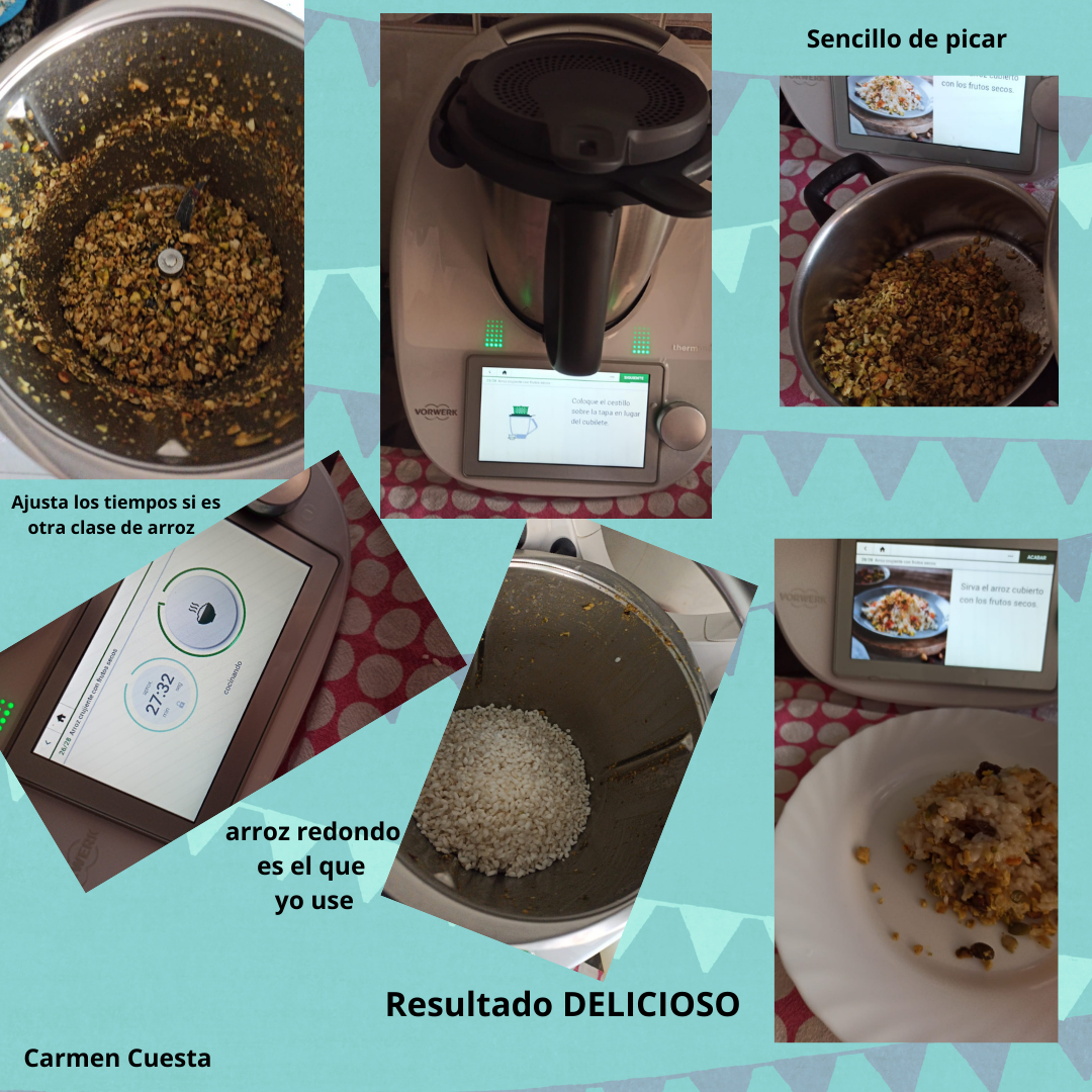4. Ponga en el vaso el arroz aclarado, el agua, los orejones, las pasas, 10 g de aceite y 1 cucharadita de sal. Coloque el cestillo, si tienes la Tm31 o la Tm5, si tienes la Tm6 coloca la tapa anti salpicaduras sobre la tapa en lugar del cubilete e inicie Cocción de arroz, Si te ha pasado que no tienes el arroz largo que te pide la receta entonces cuando te queden 14 minutos páralo porque el arroz ya lo tienes. Vierta en una fuente y remueva bien con la espátula. Sirva el arroz cubierto con los frutos secos.