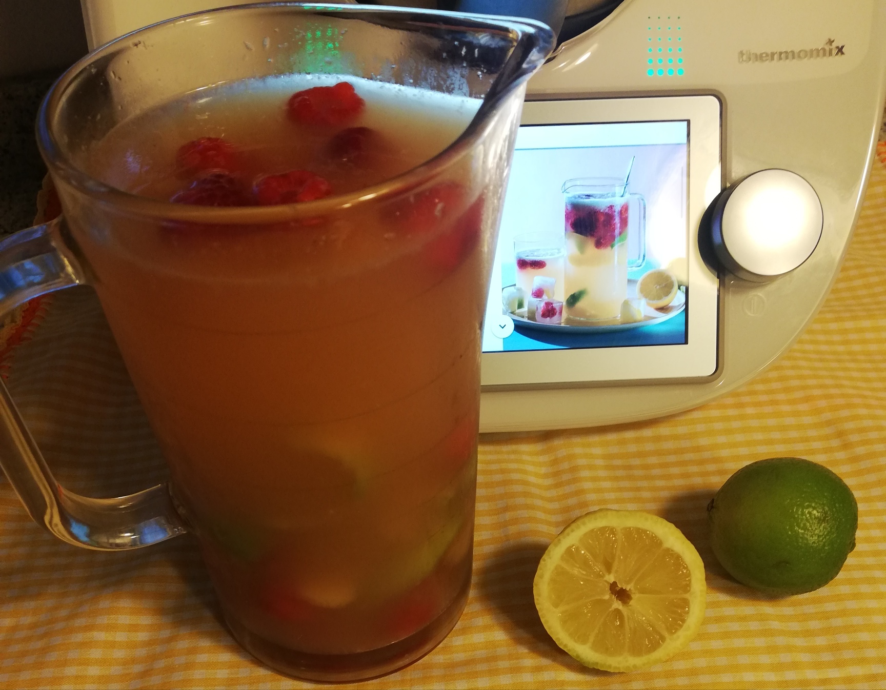 1.Ponemos el hielo en el vaso y picamos un par de segundos a velocidad 5/10 e introducimos en una jarra. A continuación incorporamos el agua con el azúcar ,las limas y los limones y programamos la función del turbo 2 seg.