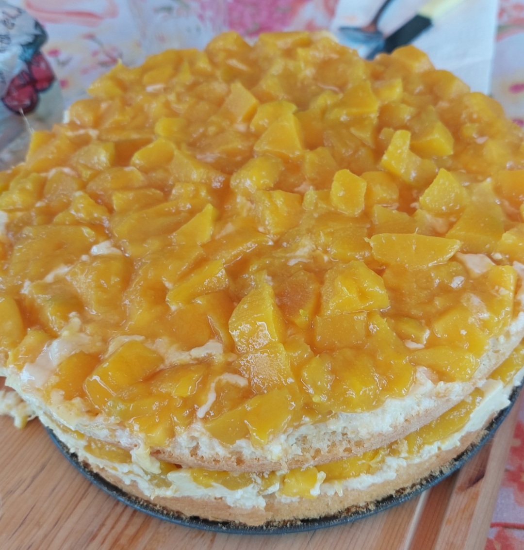 .Cortamos el bizcocho por la mitad y rellenamos con la crema pastelera y los cubos de mango,ponemos la otra mitad del bizcocho y repetimos la operación, dejamos enfriar mínimo 4 horas en la nevera y lista para comer.