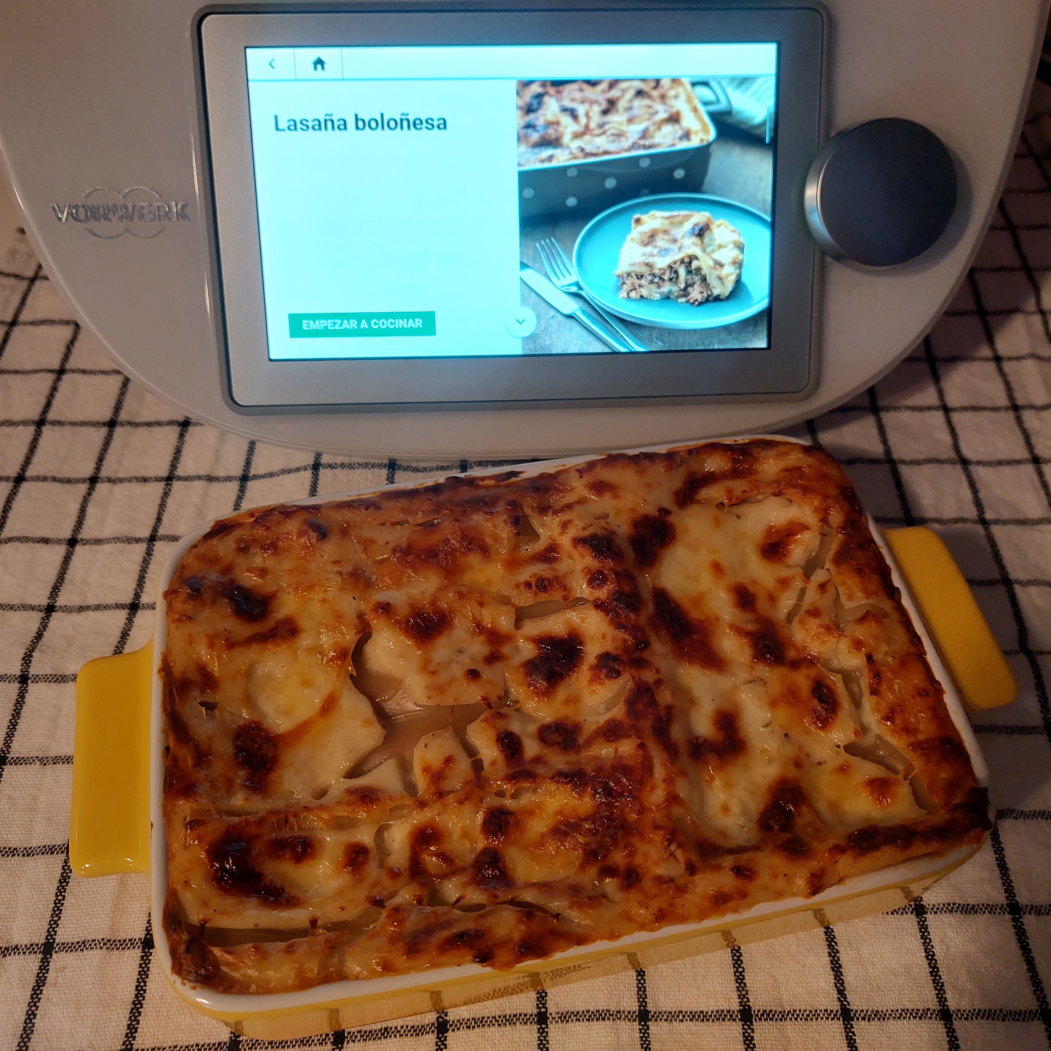 5.Empezamos a preparar la Lasaña poniendo en una fuente de horno un poco de la carne con el sofrito, una capa de las placas de Lasaña y por encima la salsa bechamel y vamos repitiendo hasta conseguir las capas deseadas y para finalizar el queso rallado que hemos rallado previamente en nuestra Thermomix.