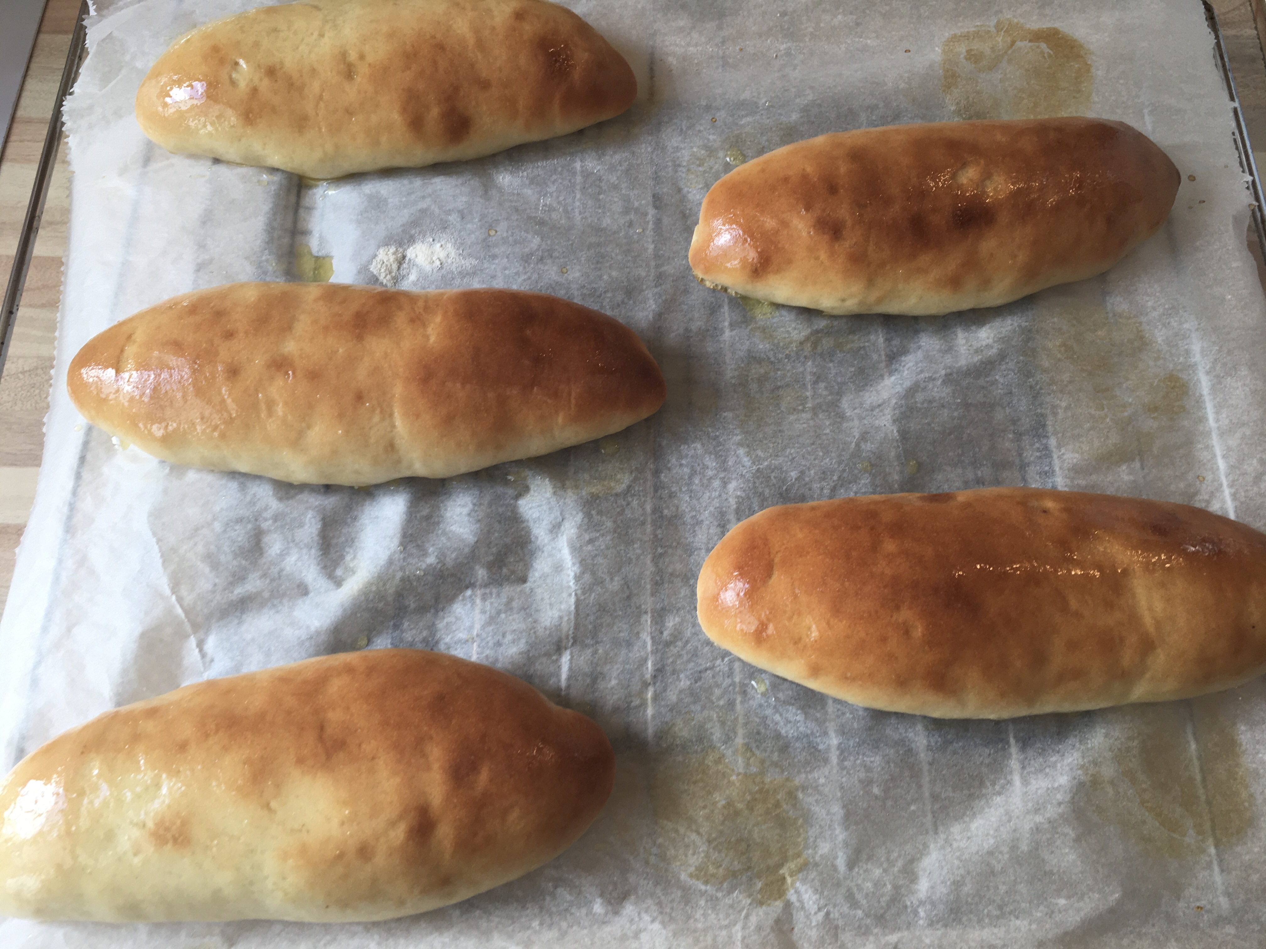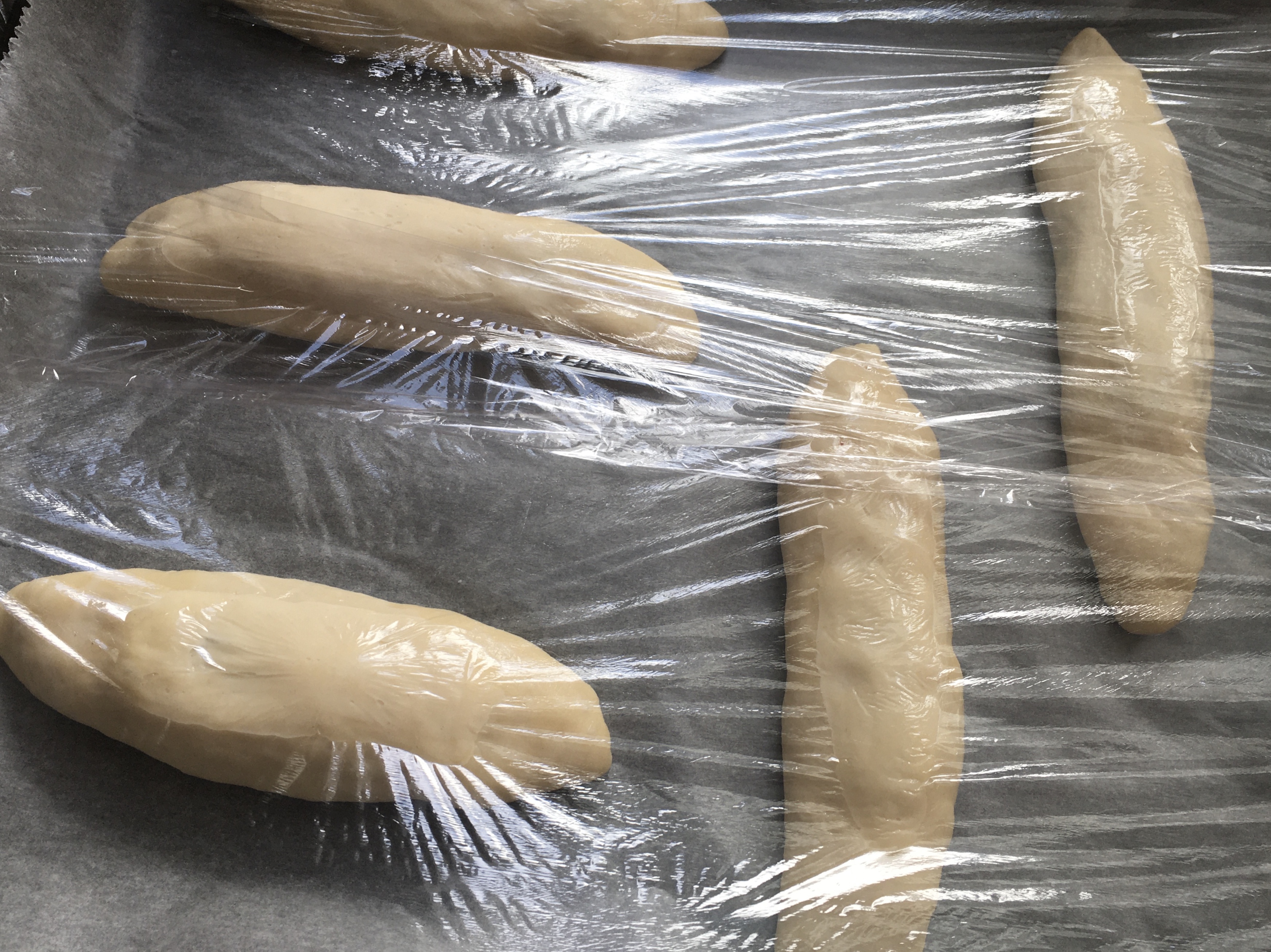 5. Coloque los bollos en la bandeja preparada dejando unos 2 cm entre ellos. Pincele con agua y cubra con film transparente hasta que doblen su volumen.