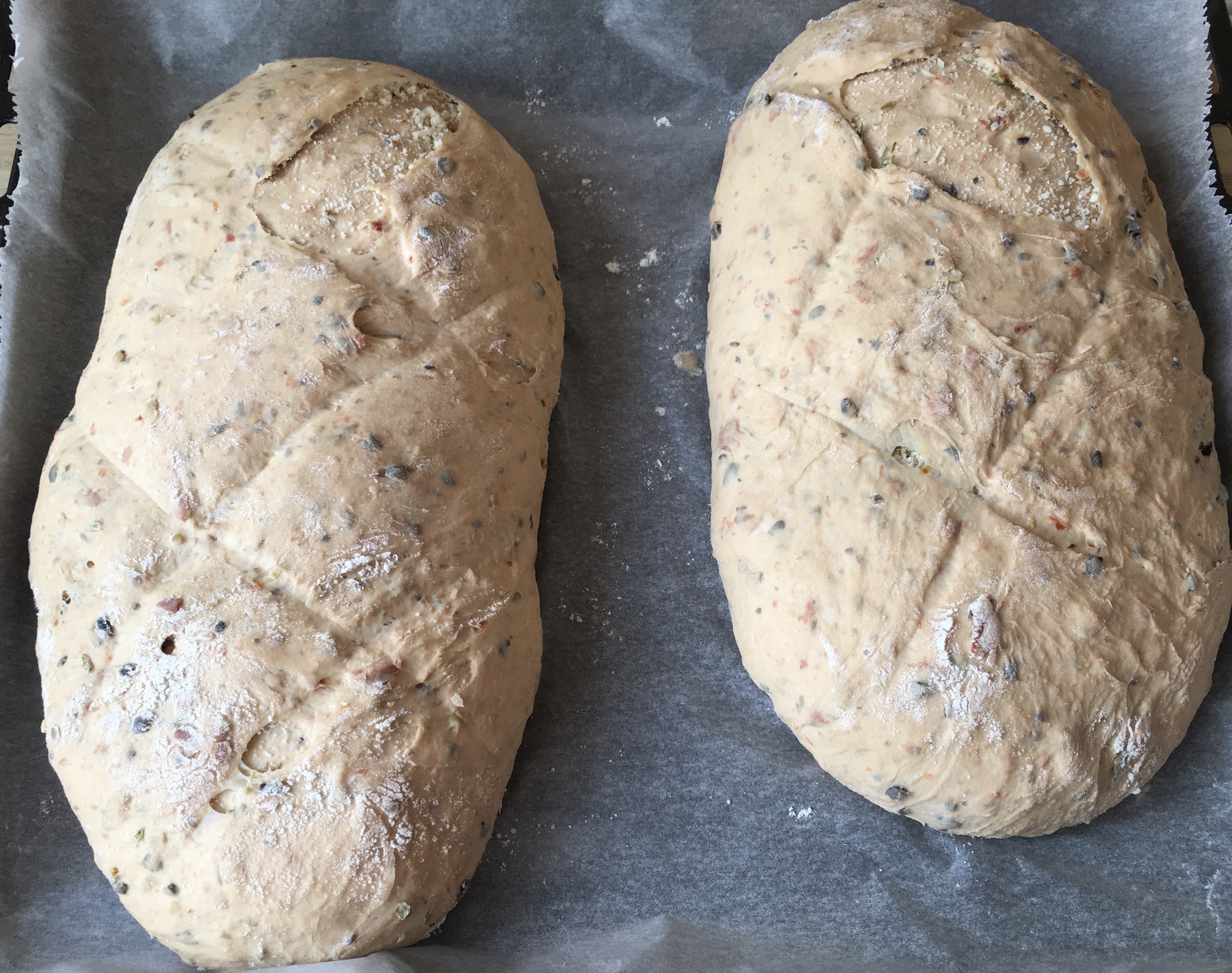 8. Divída la masa en dos, y con cada masa, aplaste la masa formando un rectángulo, espolvoree con el queso rallado y con el orégano, doble el rectángulo pellizcando los bordes para sellarla y dele forma de pan. Coloque las masas en la bandeja del horno con la parte sellada hacia abajo y deje reposar durante 30 min.