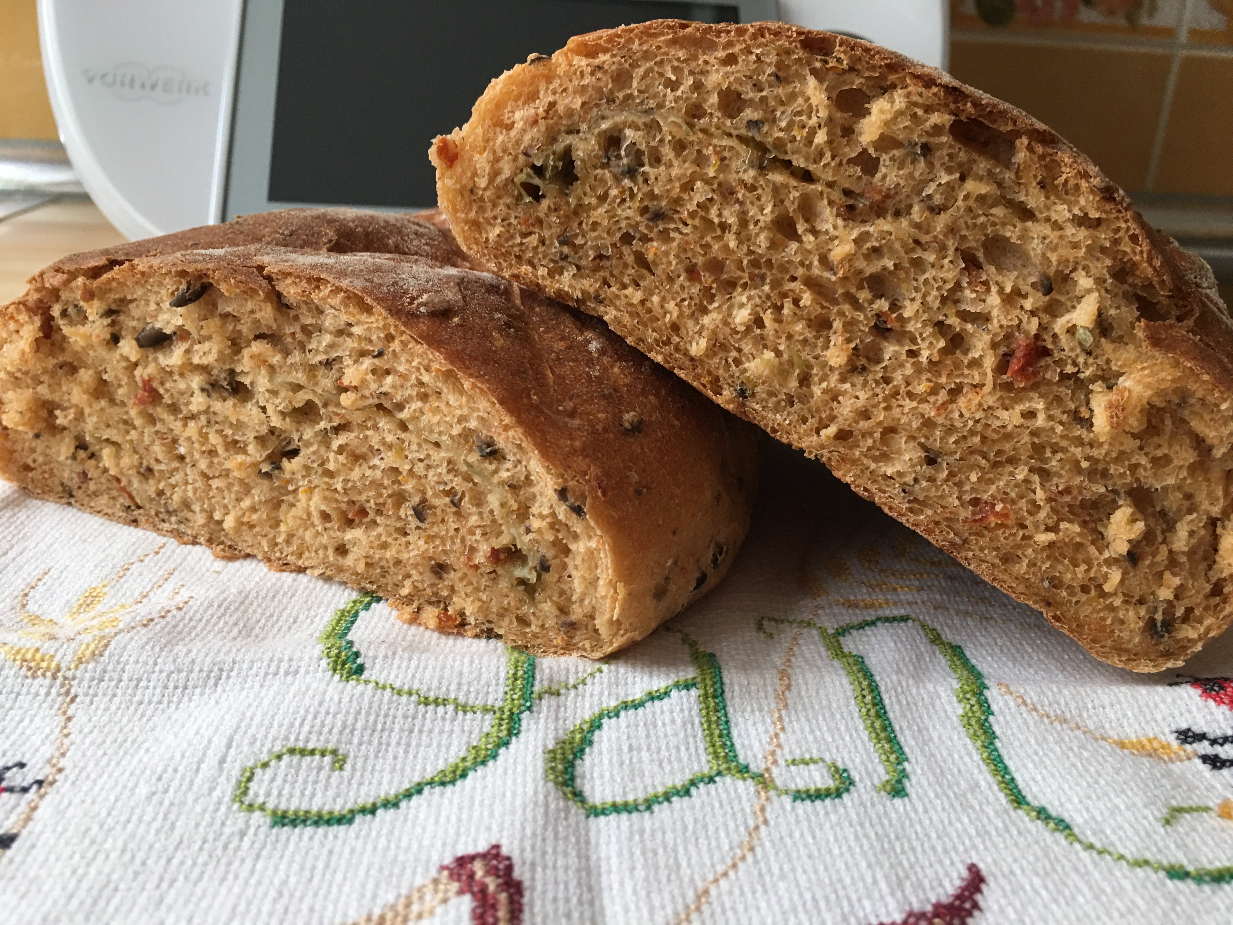 6. Baje la masa con la espátula y añada las aceitunas y los tomates reservados. Amase 1 min/vel espiga. Ponga la masa sobre un papel de horno con harina espolvoreada, y deje reposar 10 min cubierta con un paño.