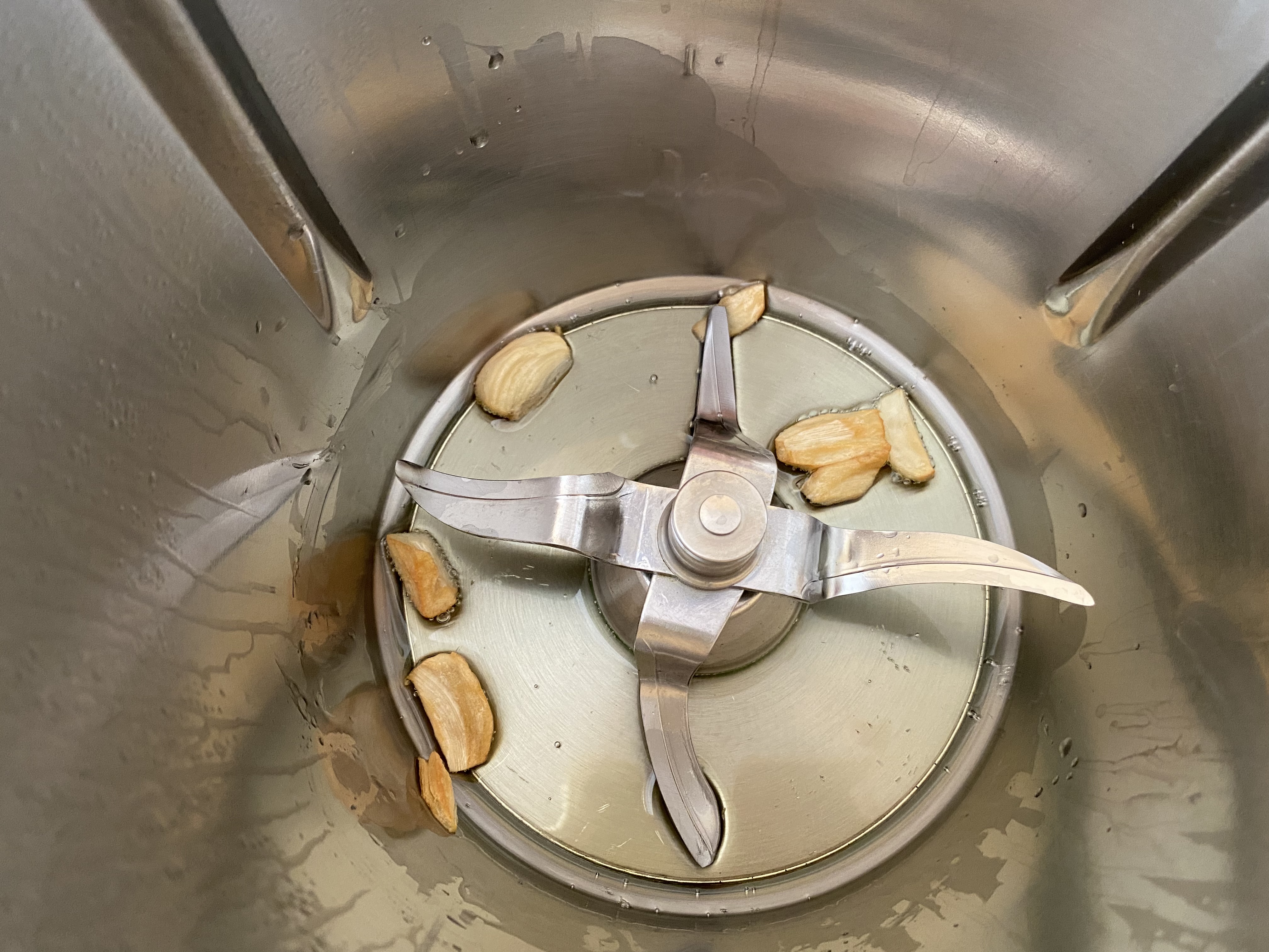 Ponga en el vaso los dientes de ajo y el aceite, dore 8min/temp varoma/ vel cuchara.