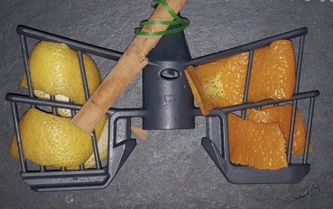 2 tiras de piel de naranja, sin nada de la parte blanca