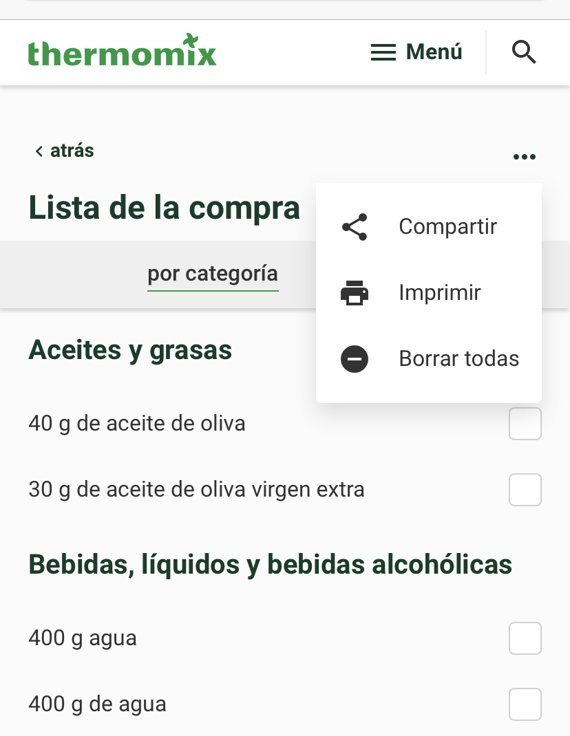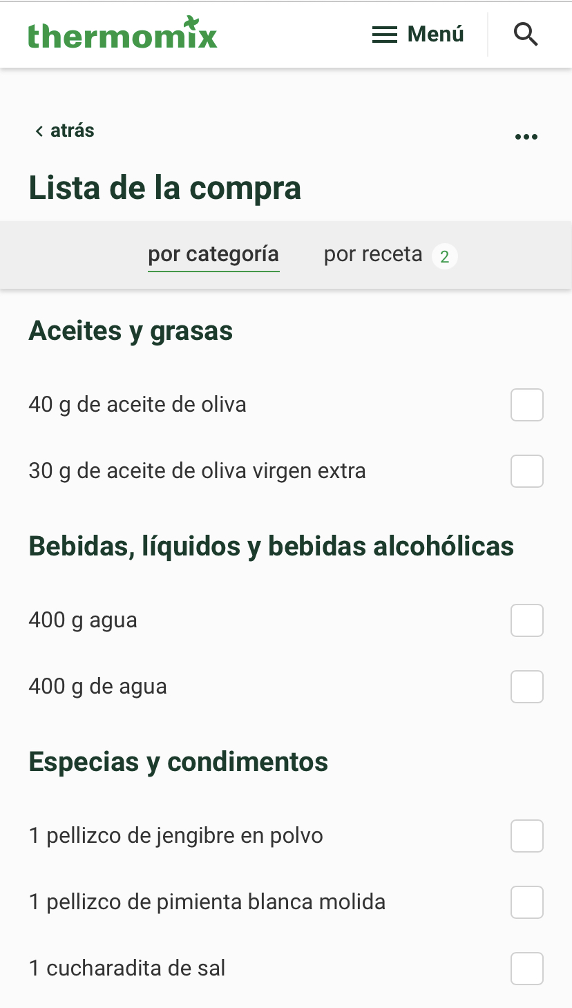 • ver los ingredientes por categoría, esto es muy practico cuando tenemos varias recetas y tenemos que hacer la compra , ya que te suma la totalidad de los ingredientes de todas las recetas que has seleccionado, y así te evitas ir receta por receta sumando ingredientes.