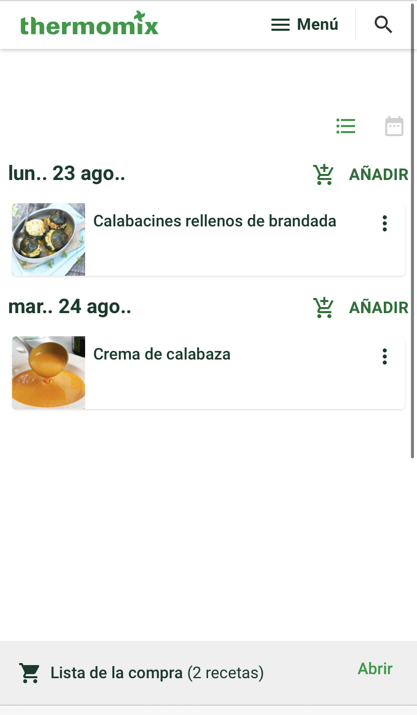 una vez seleccionadas, vas a menú, mi semana y en la parte inferior de la pantalla te sale mi lista de la compra, o según dispositivo en la parte inferior, te sale el dibujo de un carrito de la compra, lo pulsas: