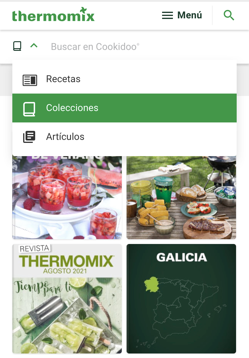 •por libros, vamos al buscador, y a mano izquierda al lado de la lupa, hay una flechita que apunta hacia abajo, la pulsamos y se nos abre un desplegable: recetas o colecciones, pulsamos sobre colecciones y así nos salen todos los libros y colecciones que disponemos en Cookidoo.