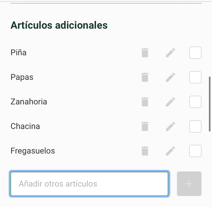 Ademas, hay casi al final de la lista de los ingredientes, un apartado de artículos adicionales, con el símbolo +, esto es para que puedas añadir todos los artículos que quieras a tu lista de la compra aunque no tengan nada que ver con nuestras recetas: por ejemplo, jabón para la ropa, la comida de las mascotas, etc…